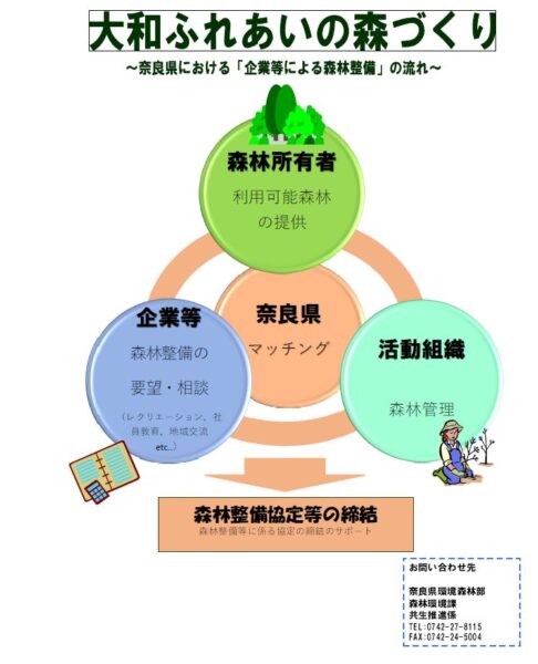 企業や団体などによる森林整備を中心とした環境保全活動の推進を目的として、県が利用可能森林の情報集約を行い、企業などからの要請に応じて森林所有者との必要な連絡調整を図ります。